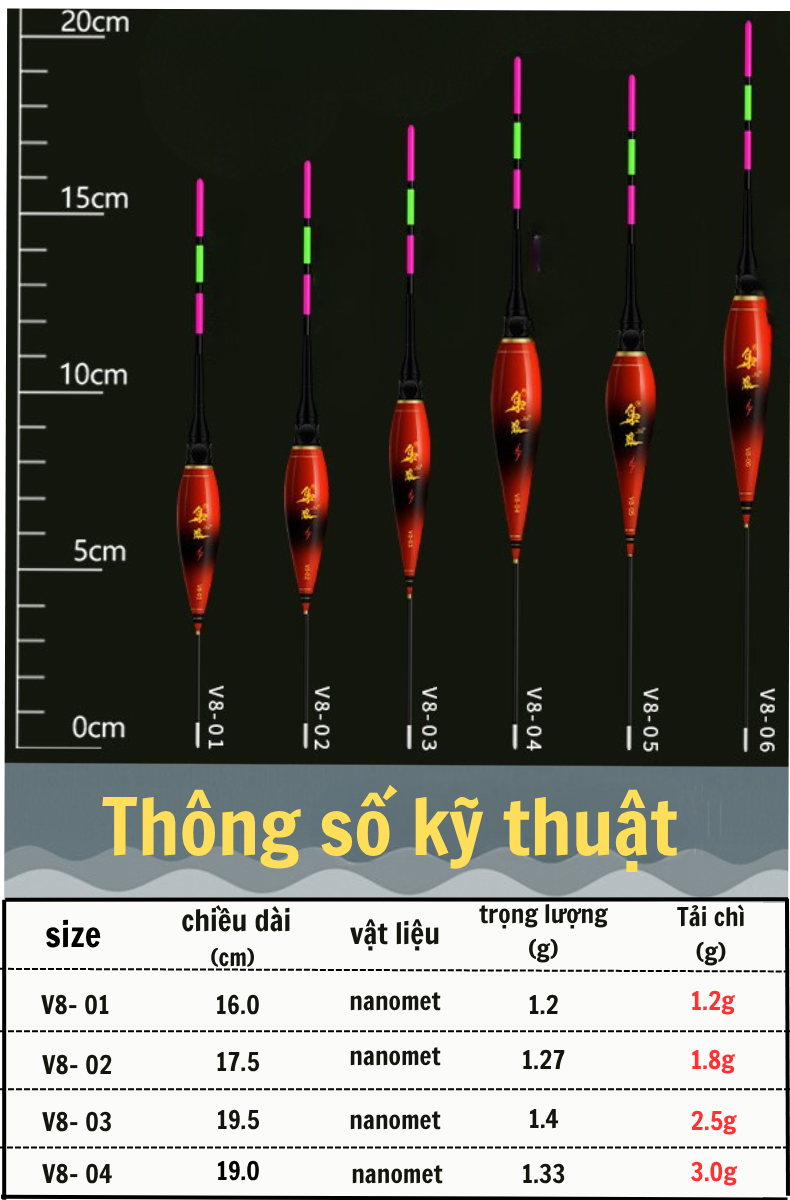 ✅ Thân phao được sơn bóng cao cấp, chống nước, chống bám bẩn, dùng lâu không phai màu.